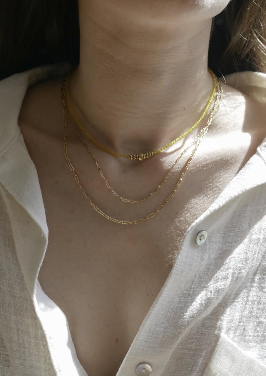 Notre double chaine dispose de fermoirs à ses extrémités ce qui permet de les attacher sur les collier disposant d’anneaux pour créer un tout nouveau collier mélangeant perles et chaines.